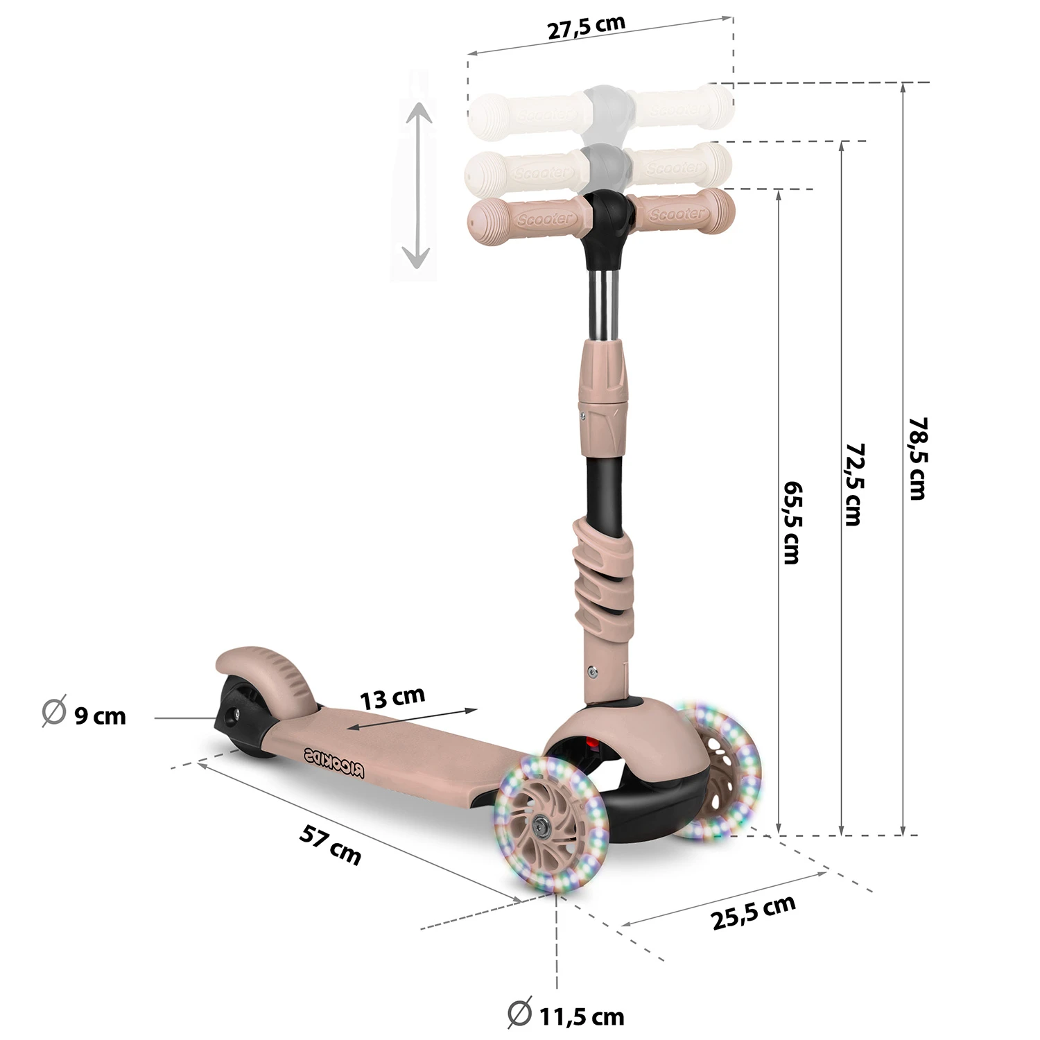 - Колеса: гумові, передні – 115 × 24 мм (з LED-підсвіткою), задні – 90 × 24 мм